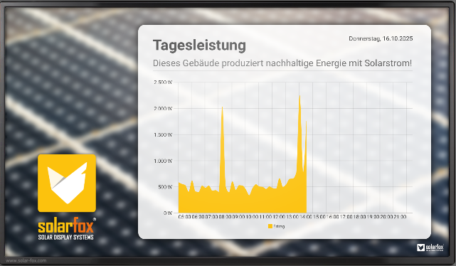 Ein Solarfox Display kann mehr als nur Zahlen zeigen. Neben den Live-Daten der Photovoltaikanlage lassen sich auch eigene Inhalte einbinden – etwa Nachhaltigkeitsprojekte, aktuelle Neuigkeiten oder Umweltziele. Das macht das Display zu einem interaktiven Medium, das Energieeffizienz greifbar macht und die Aufmerksamkeit auf das Thema erneuerbare Energien lenkt.