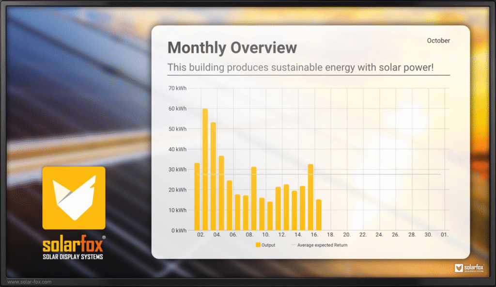 A Solarfox Display can show much more than just numbers. Alongside live data, users can add custom content such as sustainability initiatives, environmental updates, or company news. This makes the display an interactive mediumthat promotes energy efficiency and raises awareness for renewable energy in a clear and inspiring way.